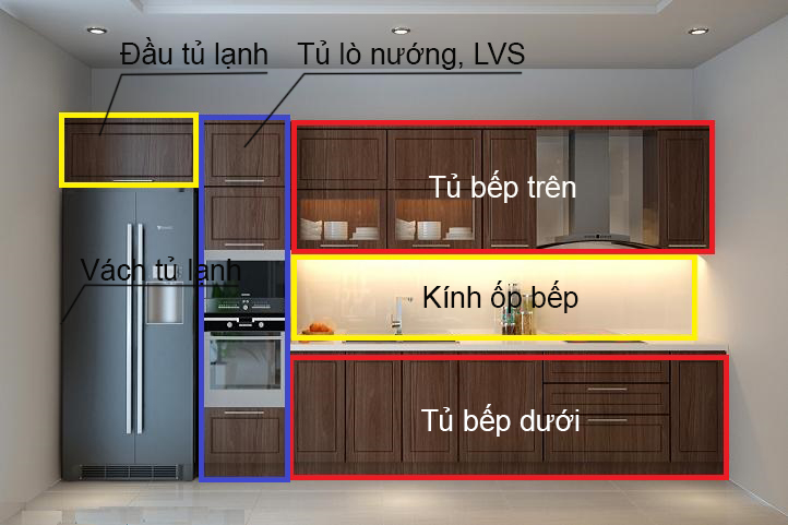 - Phần tủ bếp (gỗ, đá, kính ốp tường...)