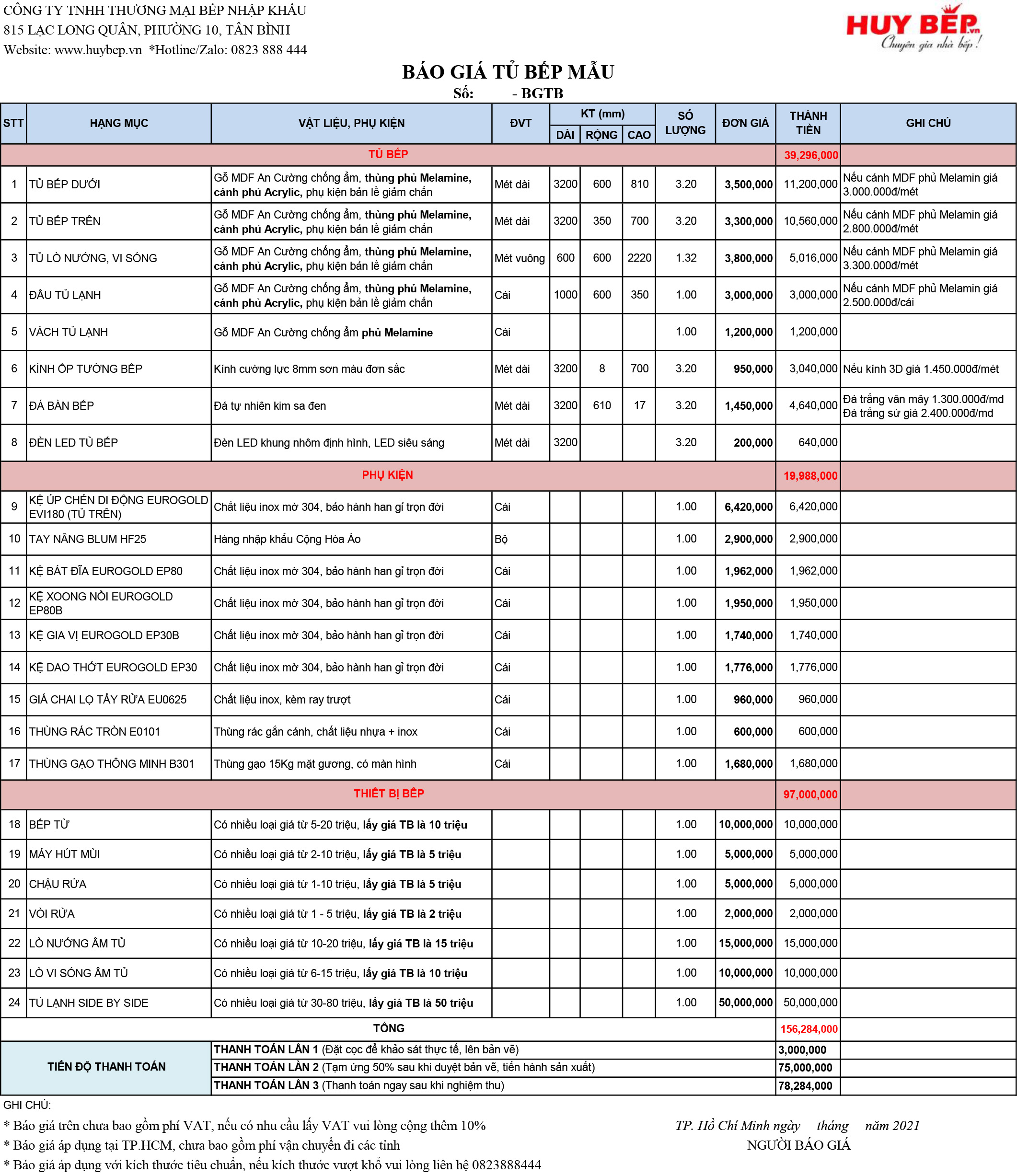 Như vậy chúng ta có thể thấy: Tổng chi phí cho bộ tủ bếp này là 156.284.000đ, trong đó sẽ chia làm 3 phần chính: