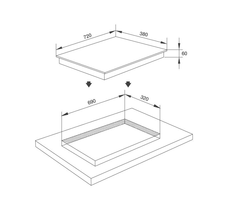 Kích thước bếp: W720 x D380 x H60mm