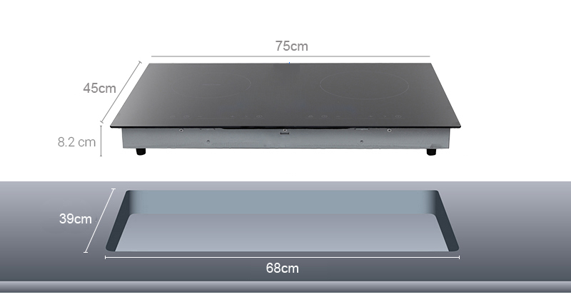 Bếp điện từ Canzy CZ 79DT có kích thước mặt kính 750x450mm, kích thước cắt đá 680x390mm, tương đương với 1 chiếc bếp gas đôi thông thường nên có thể phù hợp với mọi không gian bếp. Ngoài ra bếp cũng có thể đặt dương trên mặt bàn mà không cần cắt đá.