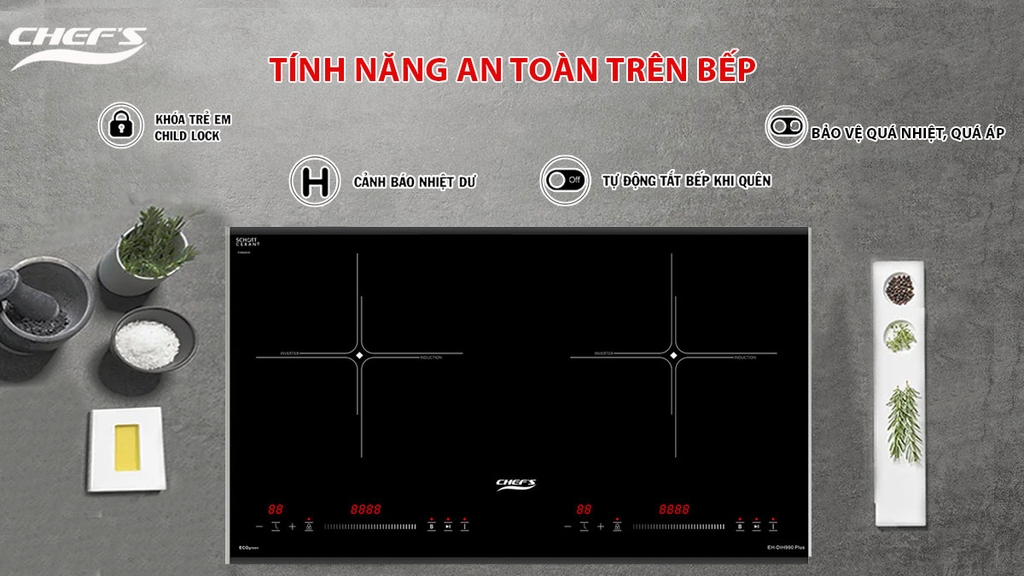Tổng thể bếp từ Chefs EH-DIH990 Plus phiên bản mới với 2 vùng điều khiển riêng biệt