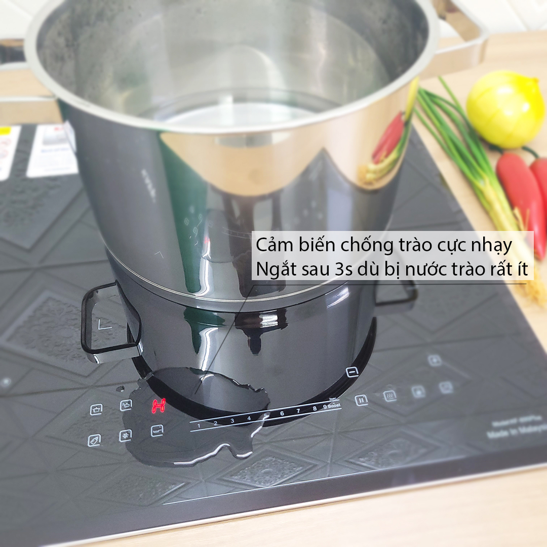 - Đầy đủ tính năng mới nhất trên bếp từ hiện nay: Nấu cơm, hâm sữa, rã đông, chiên xào, giữ ấm, tạm dừng, hẹn giờ tắt, cảm ứng chống trào, khóa trẻ em...