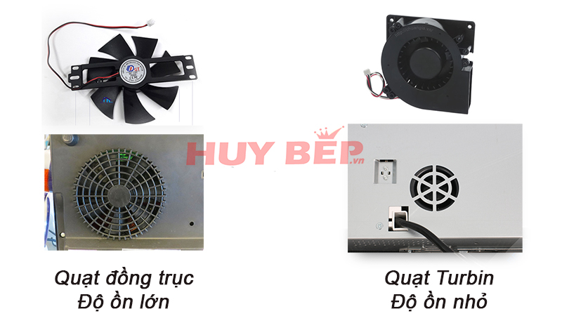 - Quạt đồng trục: thường được sử dụng trên những mẫu bếp của Malaysia, Thái Lan, Việt Nam và Trung Quốc. Nhược điểm của loại quạt này là độ ồn cao, nhưng chi phí thay thế lại rẻ hơn quạt turbin