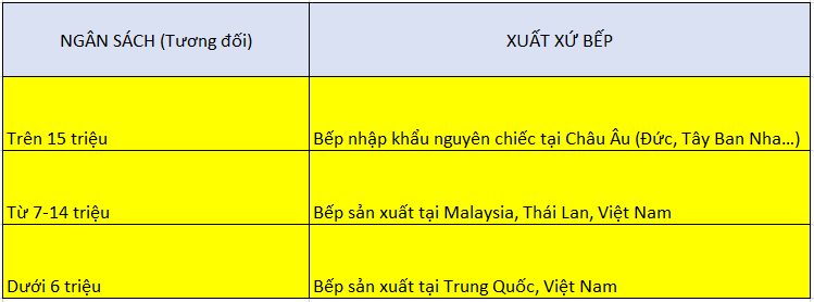 - Phân khúc từ 7-14 triệu: Phân khúc này là những bếp được sản xuất tại các nước Malaysia, Thái Lan, hoặc 1 vài mẫu bếp cao cấp của Trung Quốc. Chất lượng ở mức ổn và đặc biệt giá cả lại rất hợp lý, phù hợp với đa số thu nhập của người Việt.