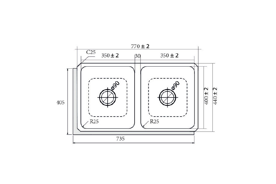 Chậu vuông đôi Chất liệu: Thép không gỉ AISI 304 Lắp âm Chiều sâu của chậu: 200 mm Lọt tủ: 900 mm  |