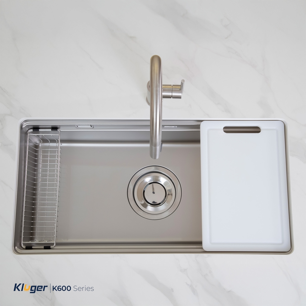 Kluger KG8644FS Plus (phiên bản trang bị đủ phụ kiện) thuộc bộ sưu tập K600 Series với chủ đề “THIẾT KẾ RỘNG RÃI – TỐI ĐA TRẢI NGHIỆM” chính là lựa chọn hoàn hảo cho căn bếp hiện đại. Nhờ thiết kế lòng chậu cực rộng và sâu, bạn hoàn toàn yên tâm khi rửa nồi, chảo hay vật dụng cỡ lớn mà không còn lo nước bắn tung tóe ra ngoài.