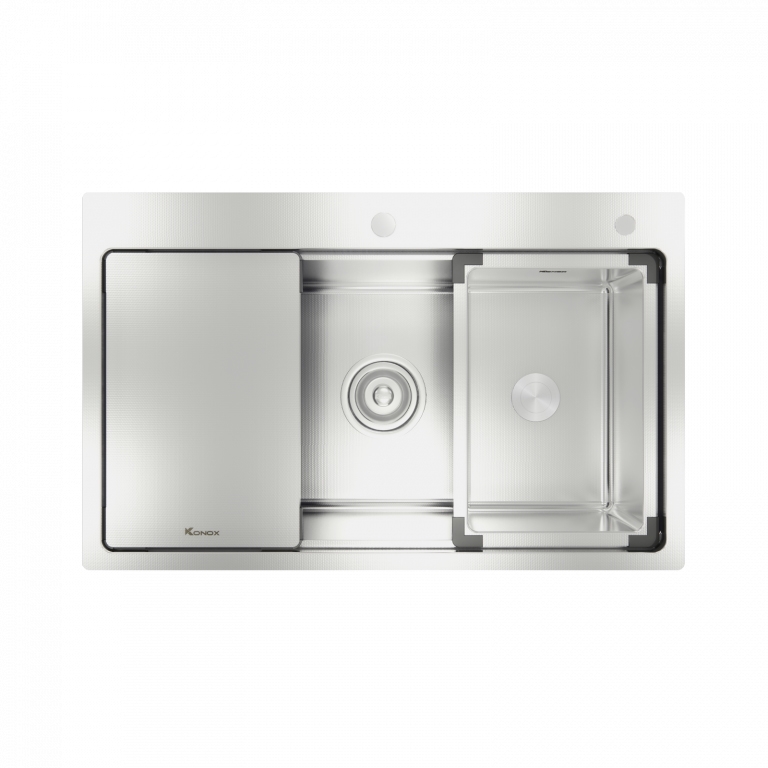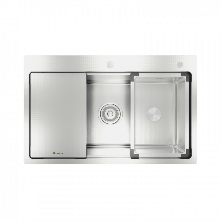 Chậu rửa bát Model KN8151TS Dekor được tối ưu công năng nhờ thiết kế hạ bậc, tích hợp phụ kiện đi kèm, biến chậu rửa bát thông thường thành “trạm sơ chế” đa năng.