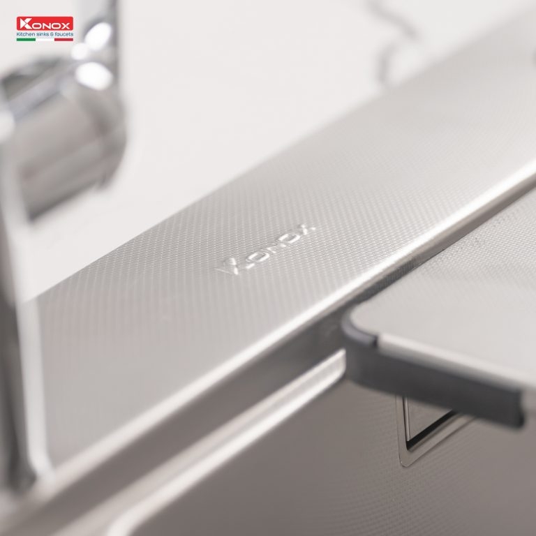 - Thiết kế hiện đại với gờ hạ bậc – tích hợp phụ kiện thông minh: Siphon, thớt inox, Colander