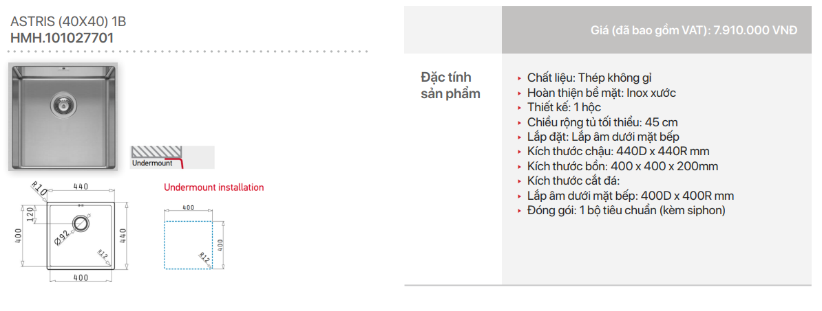 - Lắp đặt: Lắp âm dưới mặt bếp