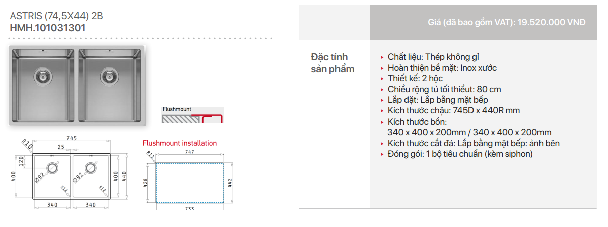 - Kích thước chậu: 745D x 440R mm
