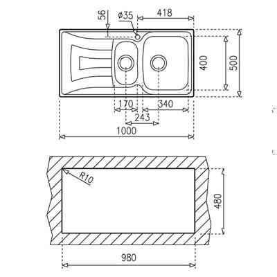 Kích thước hố chậu lớn (R/C/S) 340 x 400x 160 mm