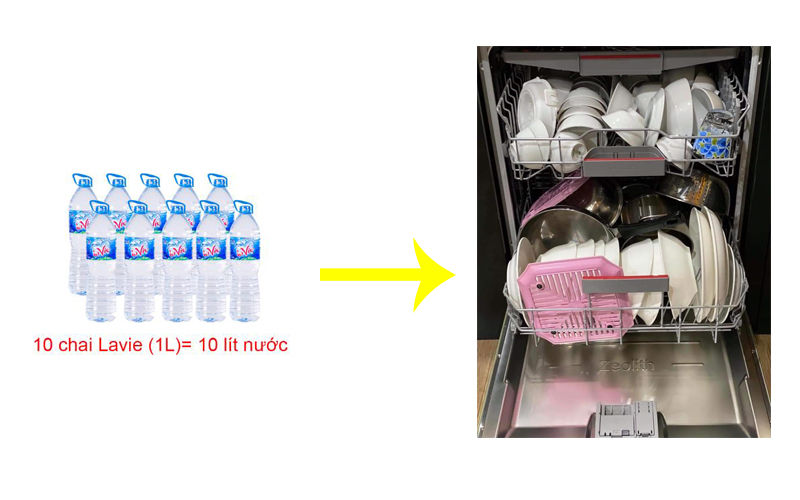 1 máy rửa chén với dung tích khoảng 13 bộ chén đĩa như thế này thì tiêu tốn trung bình đâu đó khoảng trên dưới 1kwh điện cho 1 lần rửa tương đương khoảng 1.500đ/lần rửa. Và tiêu tốn trung bình khoảng 10 lít nước cho 1 lần rửa tùy từng máy. Tương đương với10 chai nước lavie 1 lít như thế này. Các bạn thử tưởng tượng với 10 chai nước như thế này thì chúng ta có thể làm được như máy rửa bát không ạ? Chắc chắn là không rồi phải ko nào?