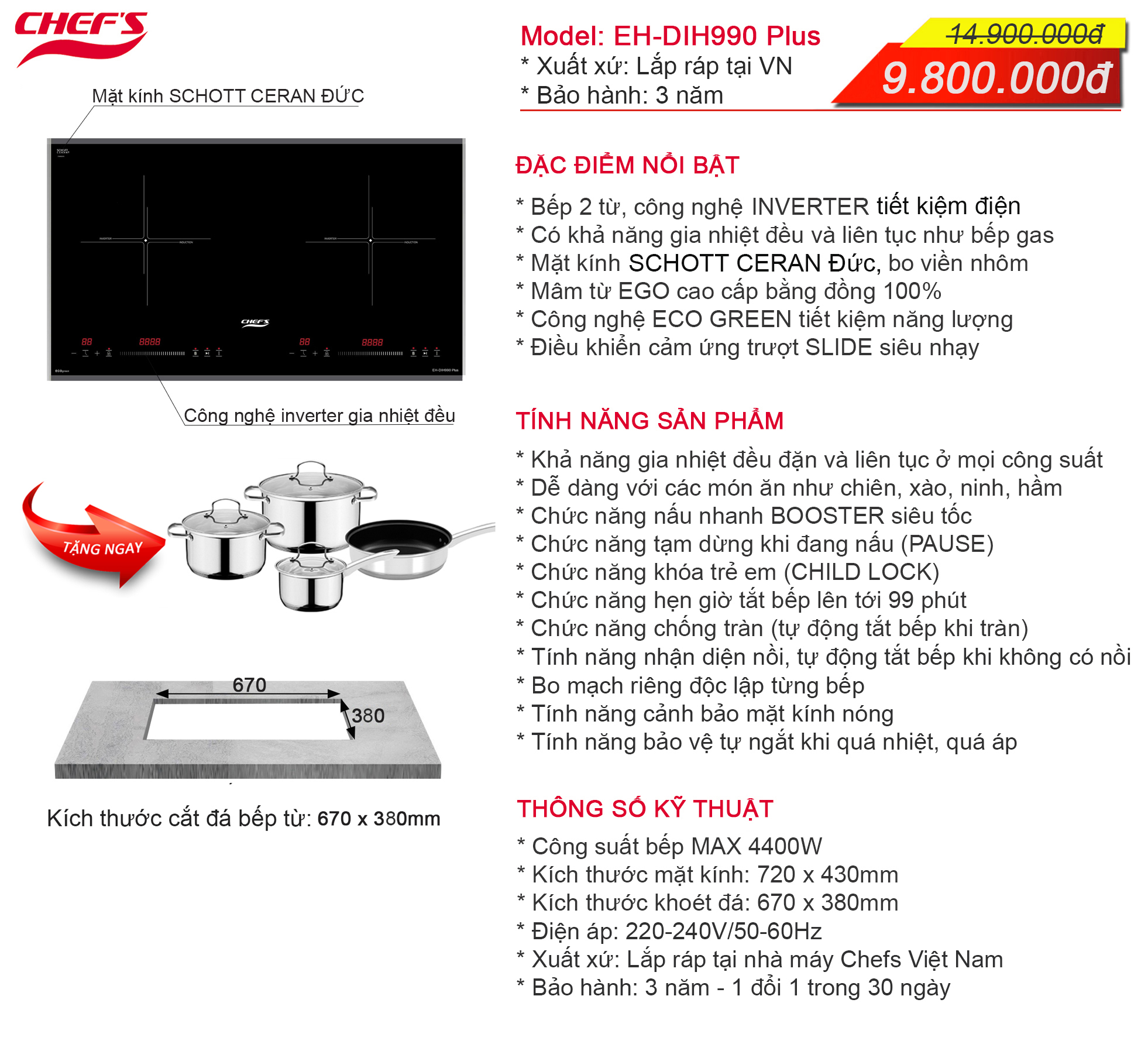 1. Bếp từ CHEFS EH-DIH990 Plus - Mặt kính Schott Ceran Đức