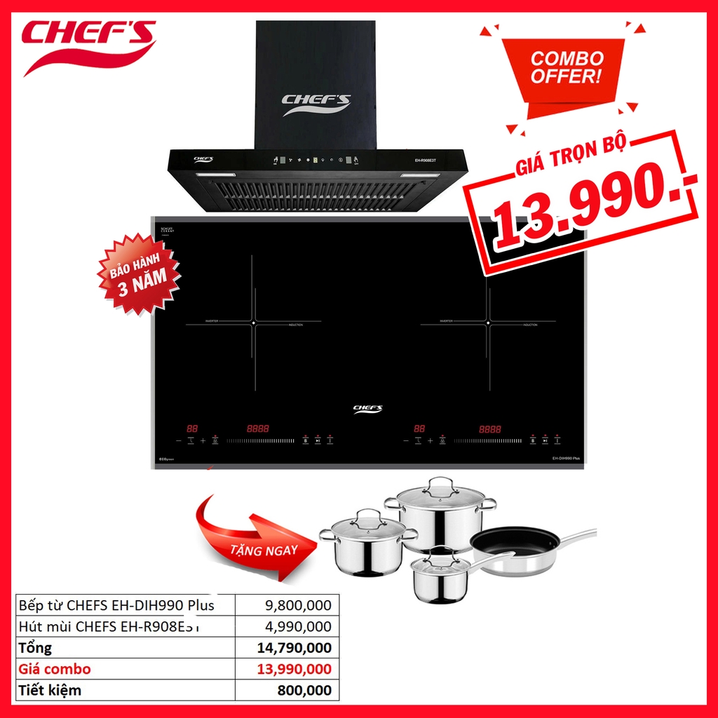 Combo HOT!!! Bếp từ CHEFS EH-DIH990 Plus & Máy hút mùi CHEFS EH-R908E3T