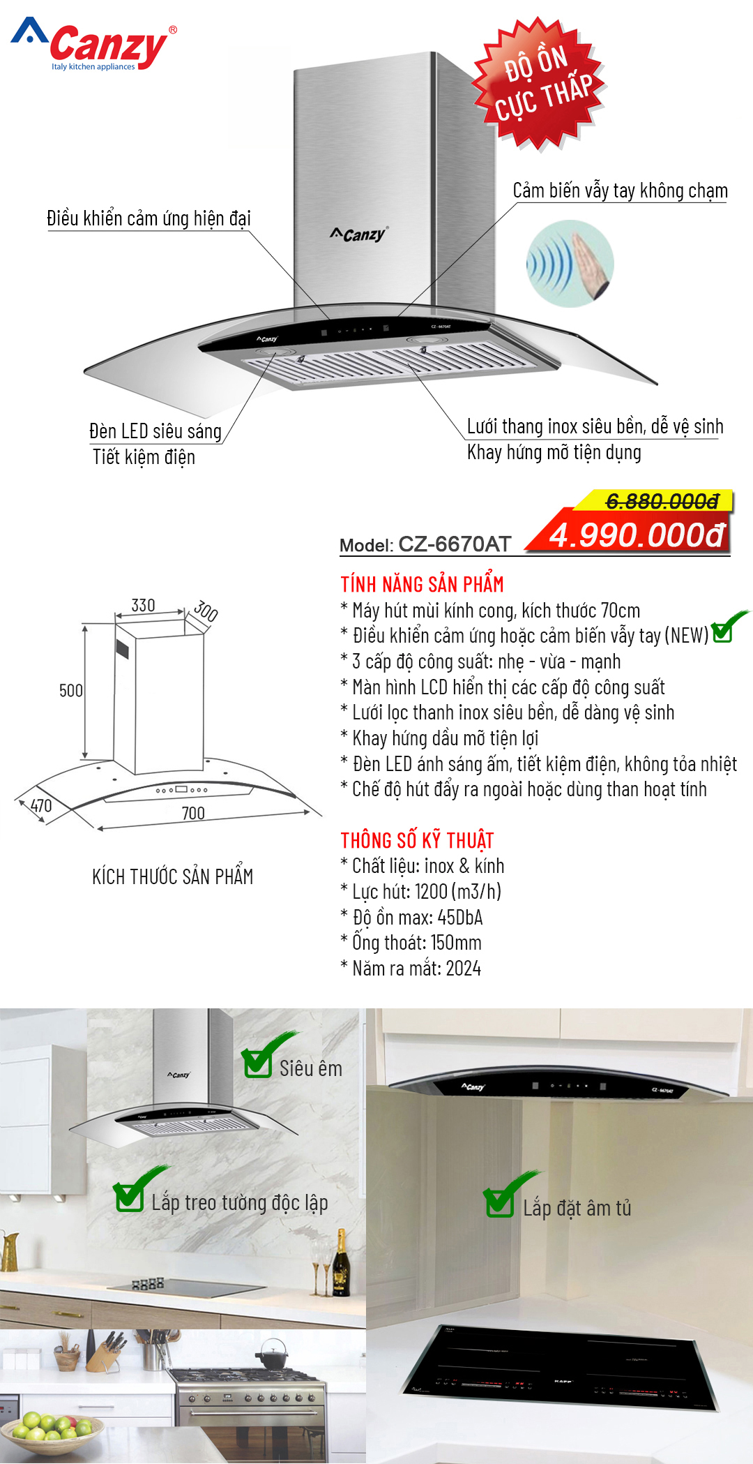 2. Máy hút mùi Canzy CZ-6670AT cảm ứng hiện đại - Bảo hành 3 năm