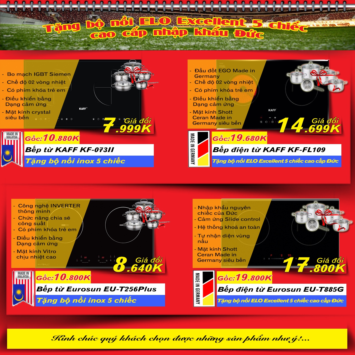 | Bếp điện từ Eurosun EU-T885G | 19.800.000 | 17800000 | CHLB Đức | Bộ nồi ELO Excellent 5 chiếc cao cấp nhập khẩu Đức |