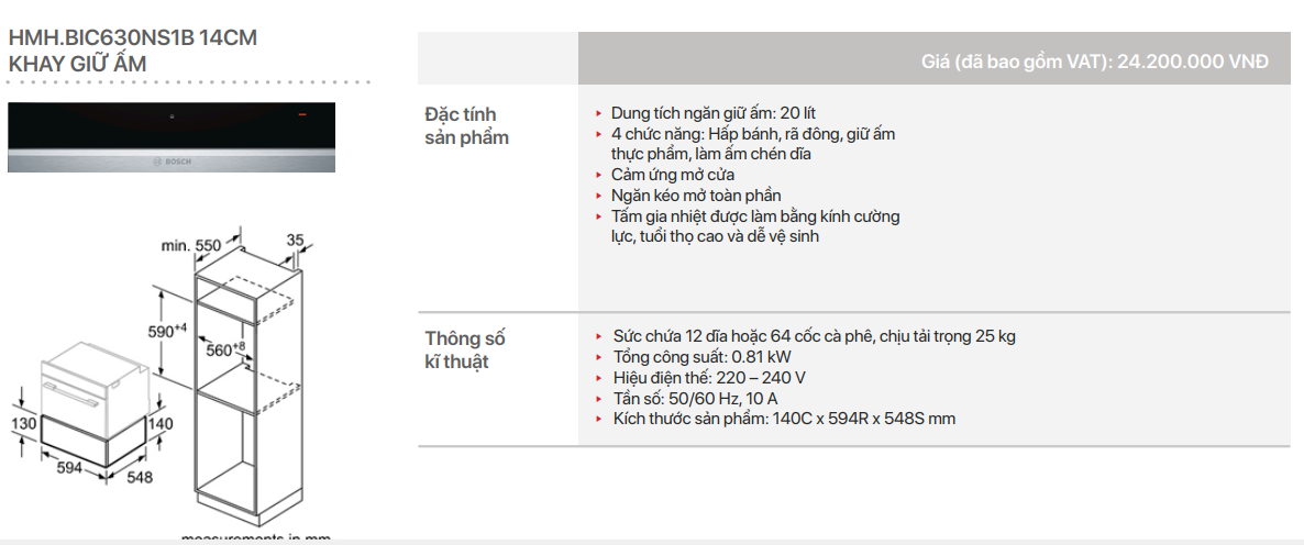 + Khay giữ ấm Bosch HMH.BIC630NS1B có 5 chương trình giữ ấm