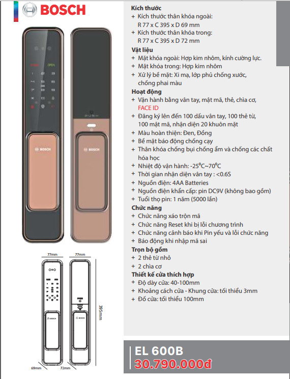 Các tìm hiểu sản phẩm khóa cửa thông minh bảo mật Bosch EL 600B nhanh và đơn giản nhất đó chính là tìm hiểu qua thông số kỹ thuật của sản phẩm được chúng tôi tổng hợp qua các ý sau: