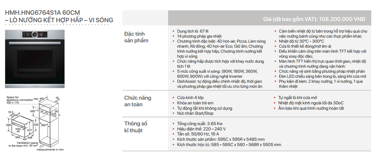 - Tự ngắt lò khi cửa mở; Nhiệt độ mặt kính ngoài tối đa 40oC; Âm báo khi quá trình nướng hoàn tất