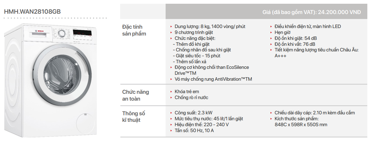 Máy giặt Bosch HMH.WAN28108GB được trang bị màn hình Led lớn và bảng điều khiển cơ thân thiện đem đến những trải nghiệm công nghệ thực sự khác biệt cho dòng máy giặt cao cấp này. Các chương trình giặt đa dạng, theo đúng nhu cầu sở thích sử dụng của tất cả các thành viên trong gia đình. Máy giặt Bosch HMH.WAN28108GB có nhiều tính năng nổi bật, máy có khả năng tiết kiệm nước và năng lượng nhờ công nghệ VarioPerfect cho cùng một kết quả giặt tẩy hoàn hảo.