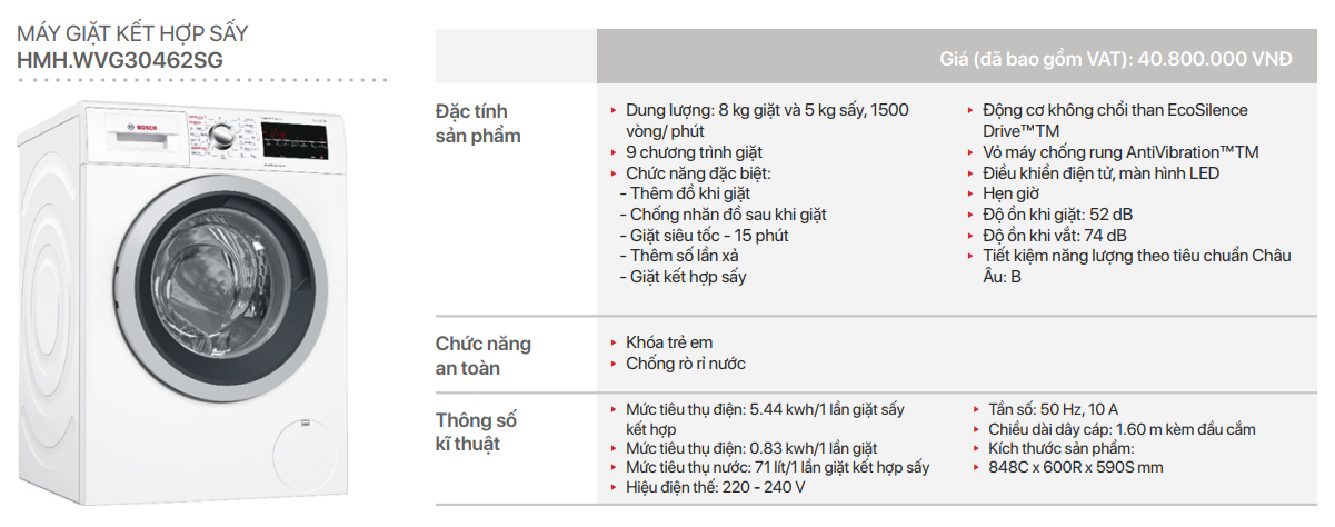 + Mức tiêu thụ điện: 5.44 kwh/1 lần giặt sấy kết hợp