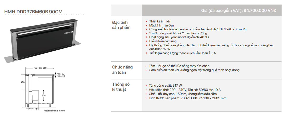 - Công suất hút tối đa theo tiêu chuẩn châu Âu DIN/EN 61591: 750 m3/h