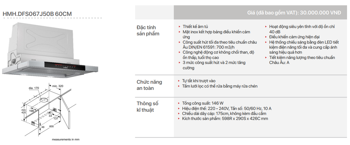 - Công suất hút tối đa theo tiêu chuẩn châu Âu DIN/EN 61591: 700 m3/h