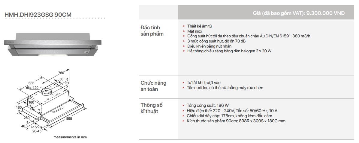 - Công suất hút tối đa theo tiêu chuẩn châu Âu DIN/EN 61591: 380 m3/h