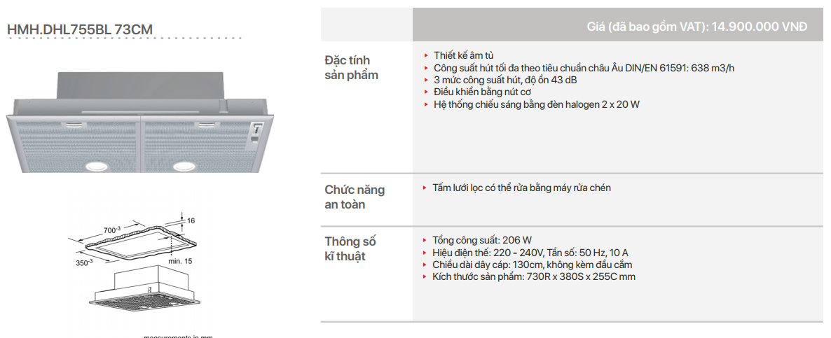 Kích thước sản phẩm: 730R x 380S x 255C mm