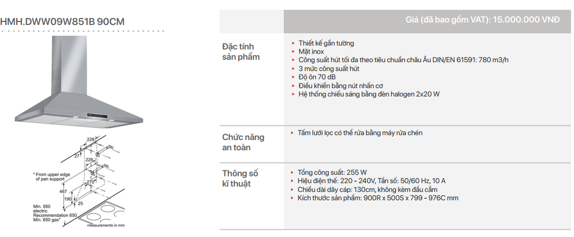 - Công suất hút tối đa theo tiêu chuẩn châu Âu DIN/EN 61591: 780 m3/h