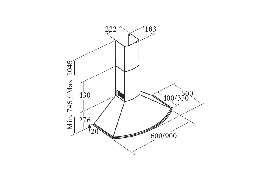 Máy hút mùi dạng gắn áp tường Bảng điều khiển điện tử Bộ định thời gian hoạt động 3 mức công suất hoạt động Công suất hút tối đa 1110 m3/h Công suất tiêu thụ tối đa 240W Độ ồn: 55 dB(A) Đèn Halogen Hoàn thiện với mặt thép không gỉ Độ nén khí: 430 Pa Ống xả: 150/125 mm Xuất xứ: Tây Ban Nha |