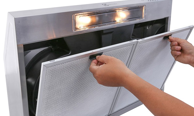 2 miếng lọc có thể dễ dàng tháo ra bằng cách gạt nhẹ phần lẫy màu đen. Từ đó, người dùng có thể vệ sịnh đình kỳ cho miếng lọc để việc lọc mùi, hút mùi được hiệu quả hơn, giảm bớt lượng dầu mỡ bám két vào bề mặt miếng lọc, gây cản trở luồng khí lưu thông. Màng này nên được rửa thường xuyên (ngâm nước nóng, dùng bàn chải và nước rửa chén để làm sạch màng lọc).