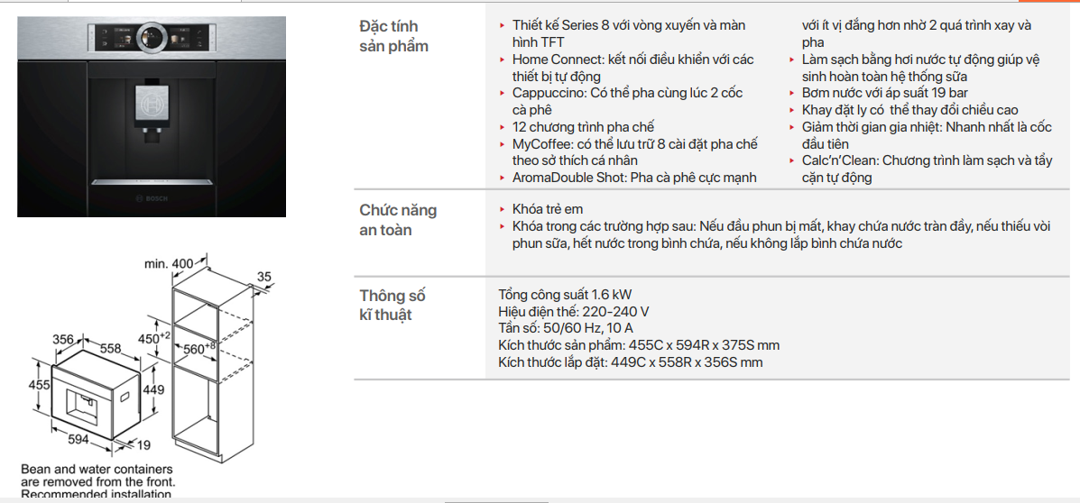 - Tính năng OneTouch cho các loại đồ uống Ristretto, Espresso, Espresso Macchiato, cà phê, cappuccino, latte macchiato, cà phê trắng
