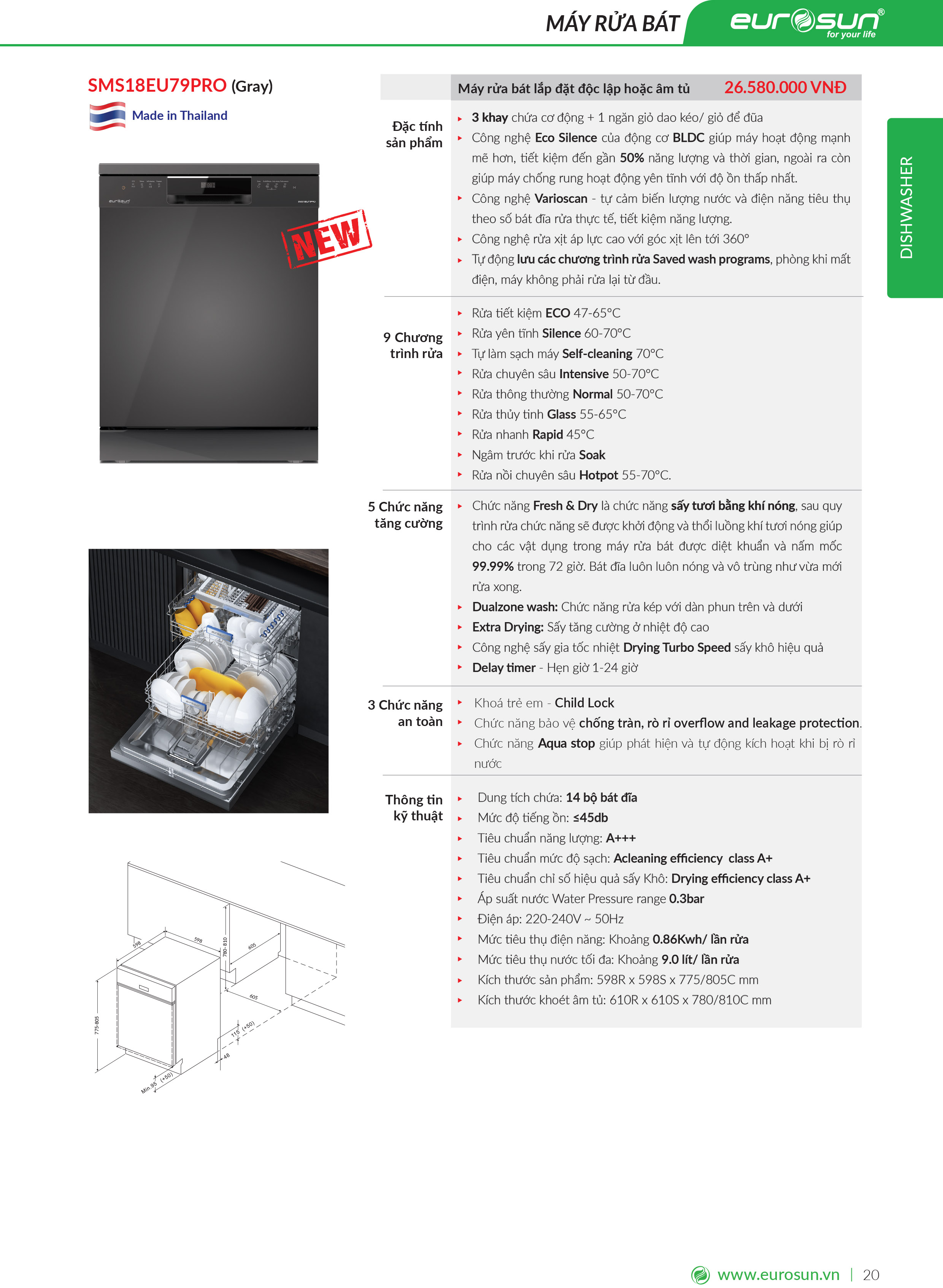 Thông số chi tiết máy rửa bát Eurosun SMS18EU79PRO new