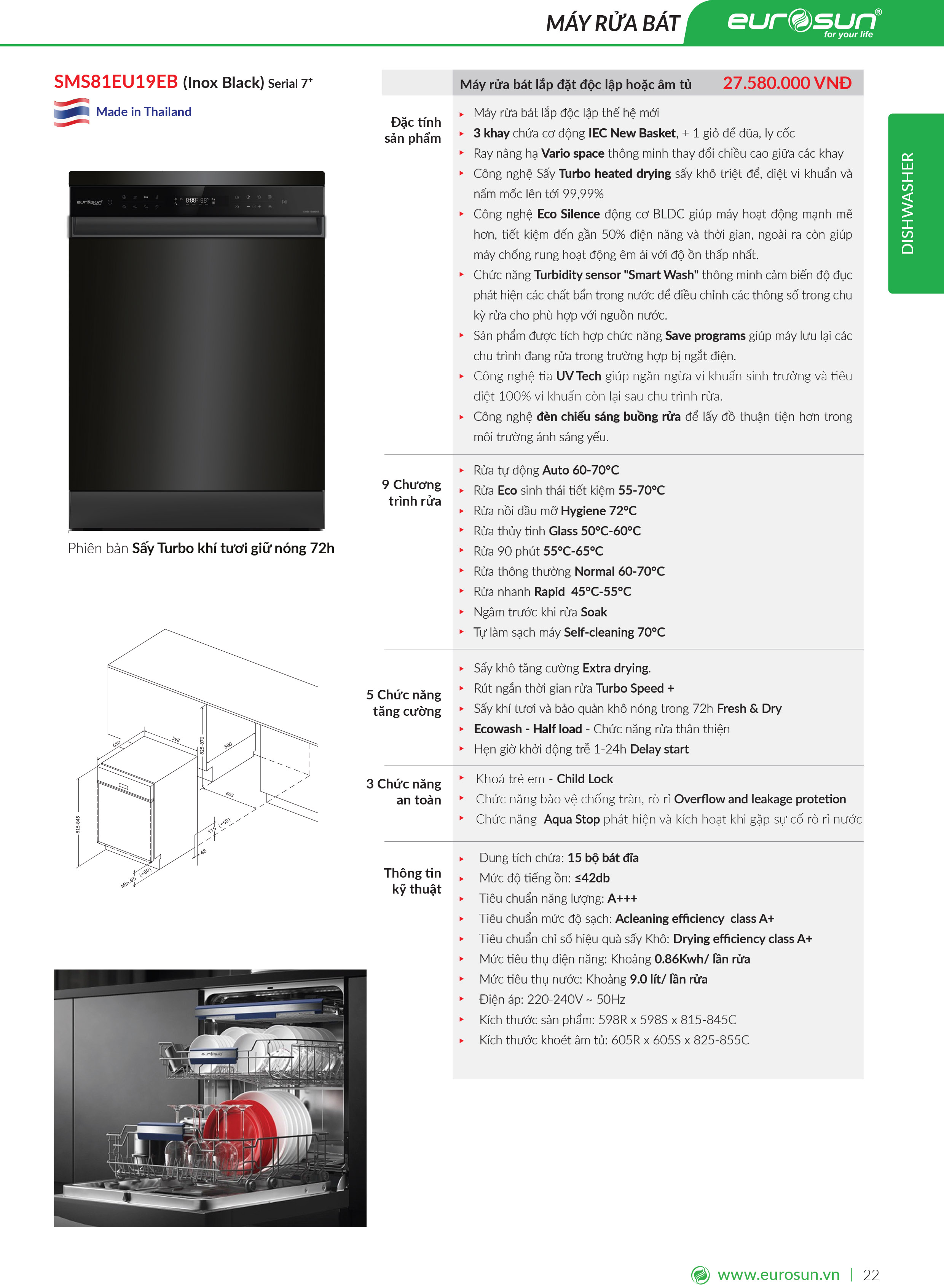 Thông số chi tiết máy rửa bát Eurosun SMS81EU19EB - Made in Thailand
