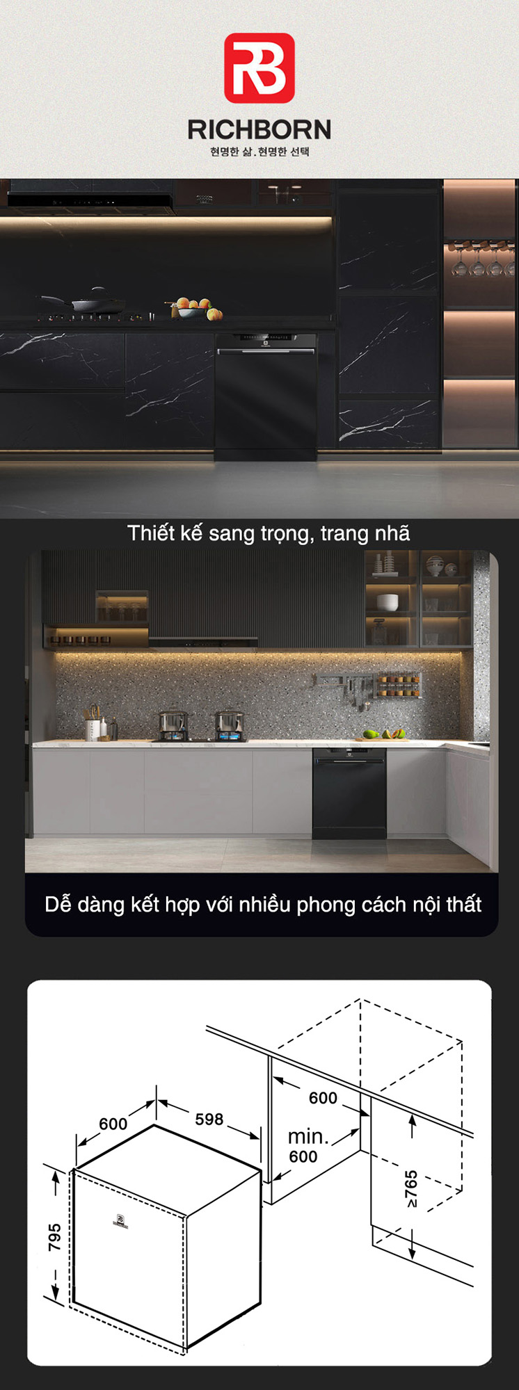 - Kích thước lắp âm: ≥ C765xR598xS600 mm