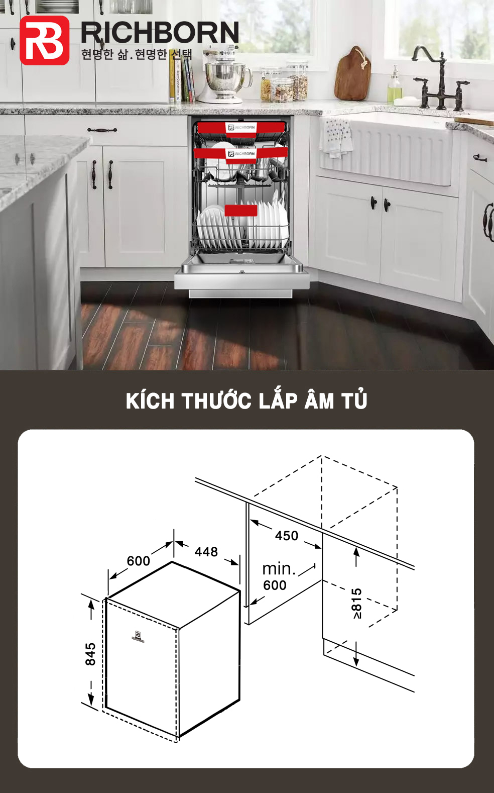 - Kích thước lắp âm: ≥ C815xR455xS585mm