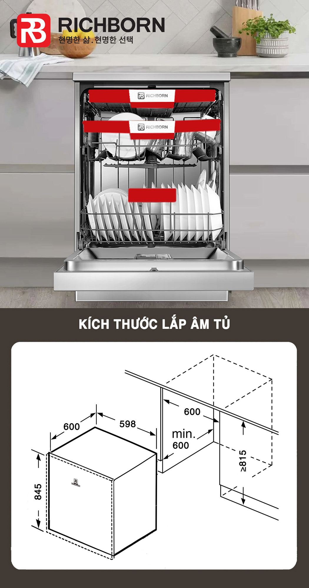 - Kích thước lắp âm: ≥ C815xR598xS585 mm