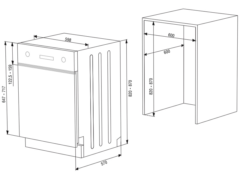 + Kích thước hộc tủ: 820 – 877C x 600R x 570S mm