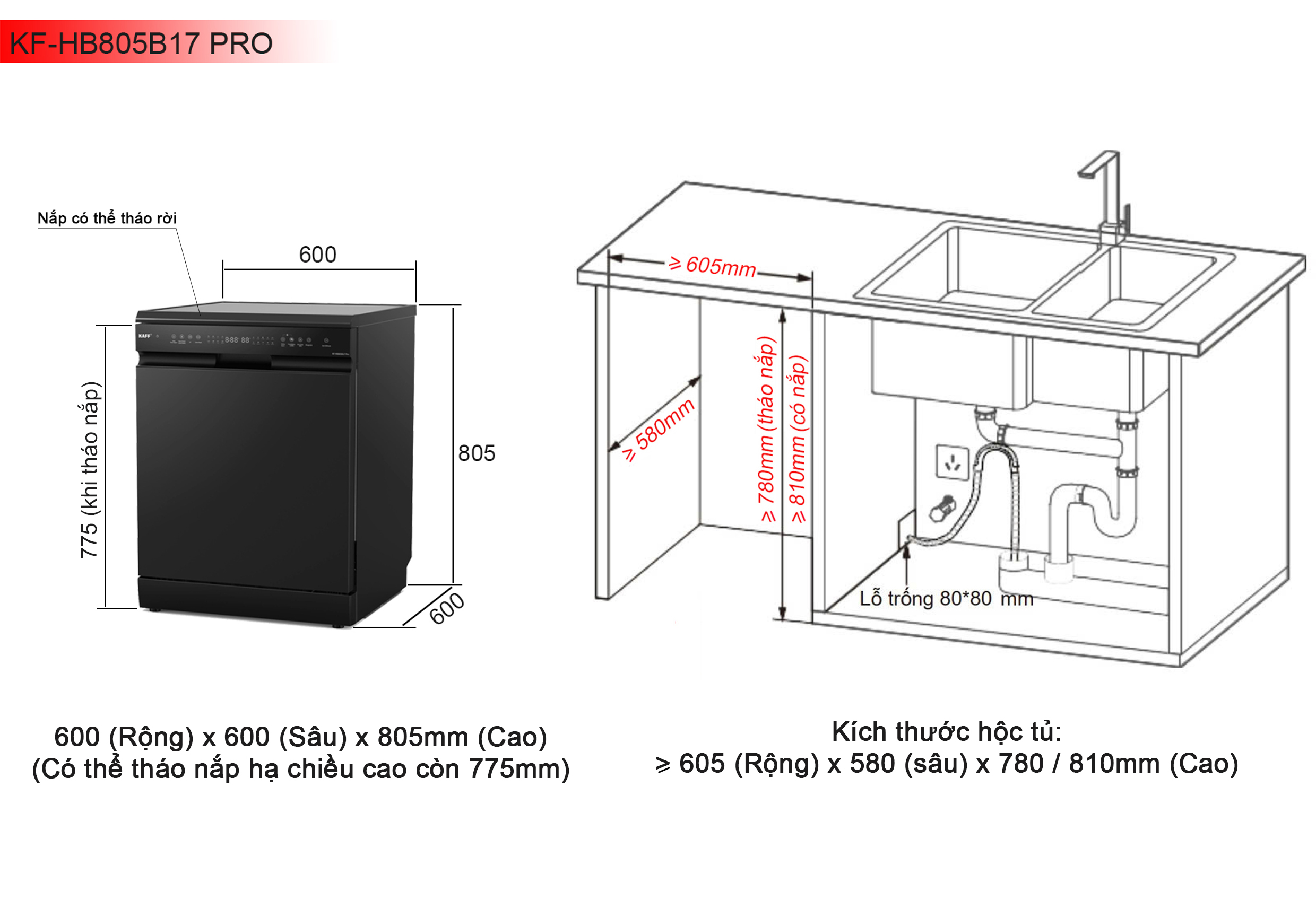 Kích thước lắp đặt máy rửa bát KAFF KF-HB805B17 PRO