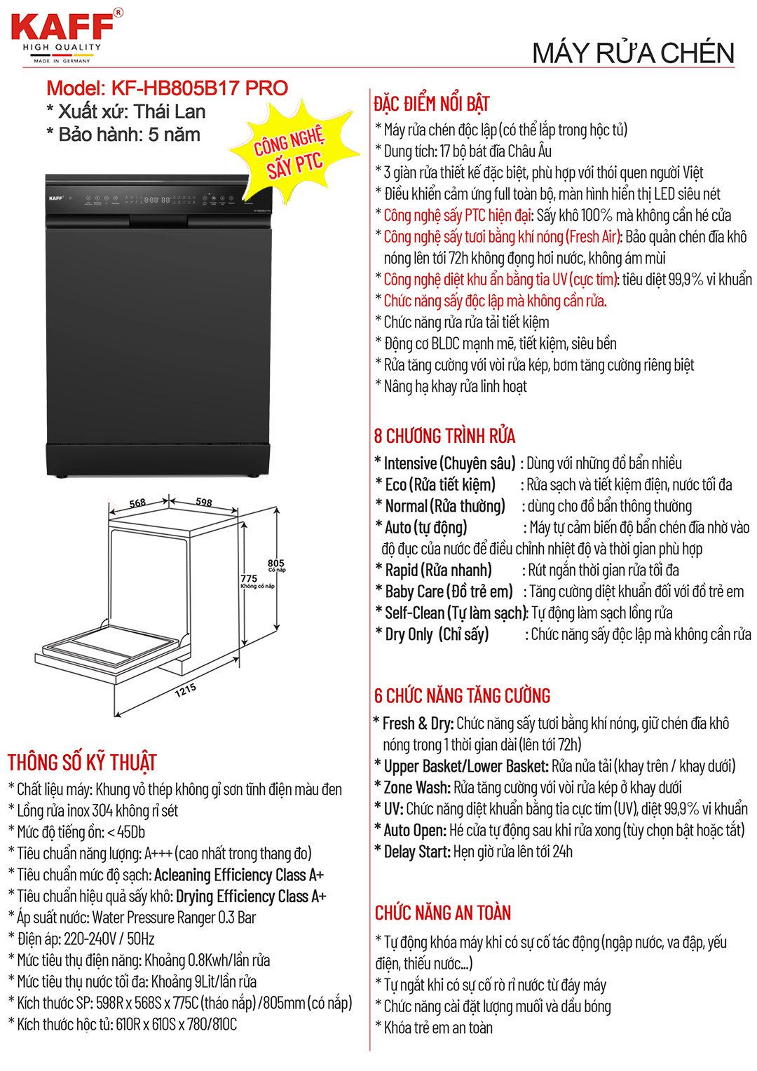 Bảng tóm tắt thông số máy rửa chén KAFF KF-HB805B17PRO