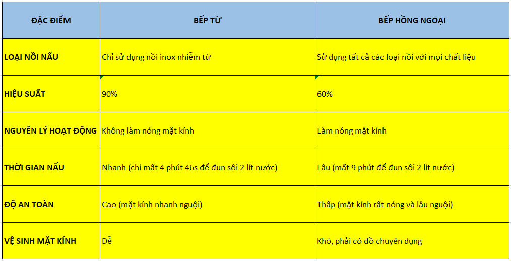 CÓ THỂ TÓM TẮT SỰ KHÁC NHAU GIỮA BẾP TỪ VÀ BẾP HỒNG NGOẠI QUA BẢNG SAU: