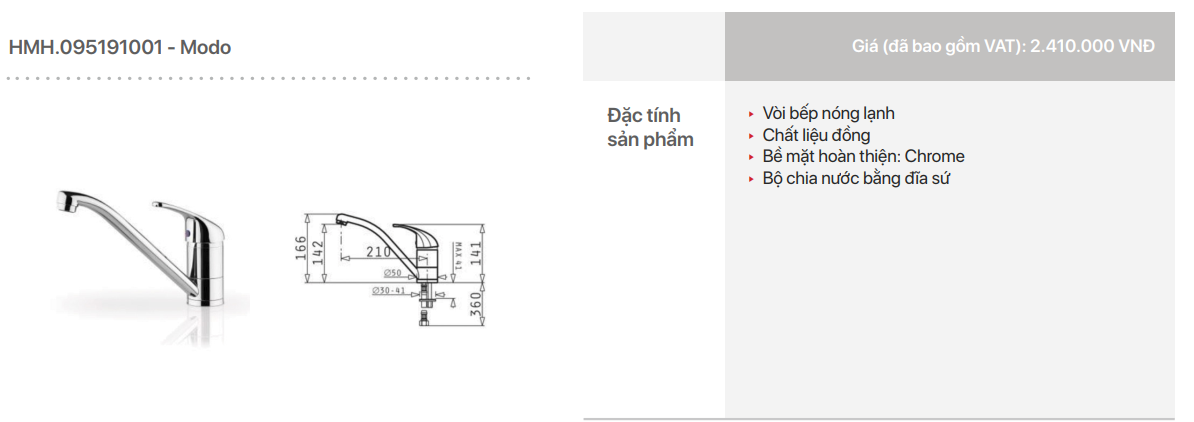 - Vòi đơn ống dài với cơ cấu trộn nước bằng đĩa gốm